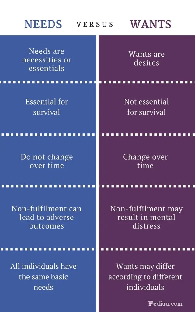 | Needs | Wants |